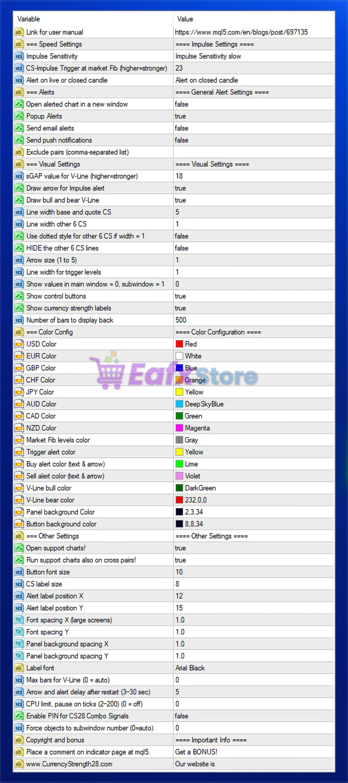 The Advanced Currency IMPULSE with ALERT indicator for MetaTrader 4 is a momentum-based currency strength tool designed to identify impulse moves, market Fibonacci triggers, and strong directional bias across multiple currency pairs. Based on the provided settings table, this configuration is clearly optimized for trend confirmation and impulse trading, rather than scalping noise.