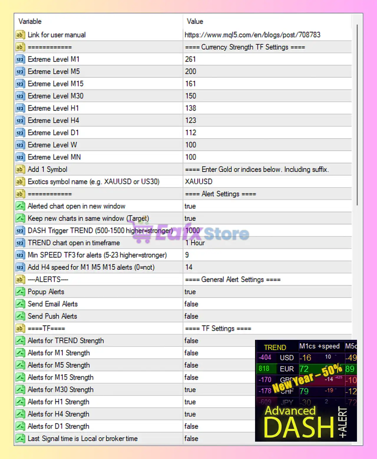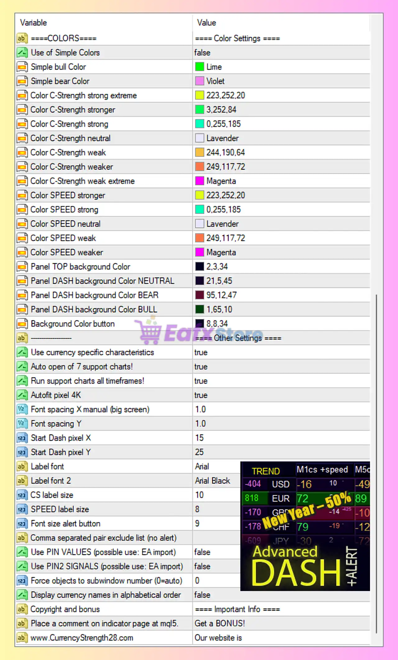 This configuration of Advanced Dashboard for Currency Strength and Speed MT4 is expertly tuned for:
