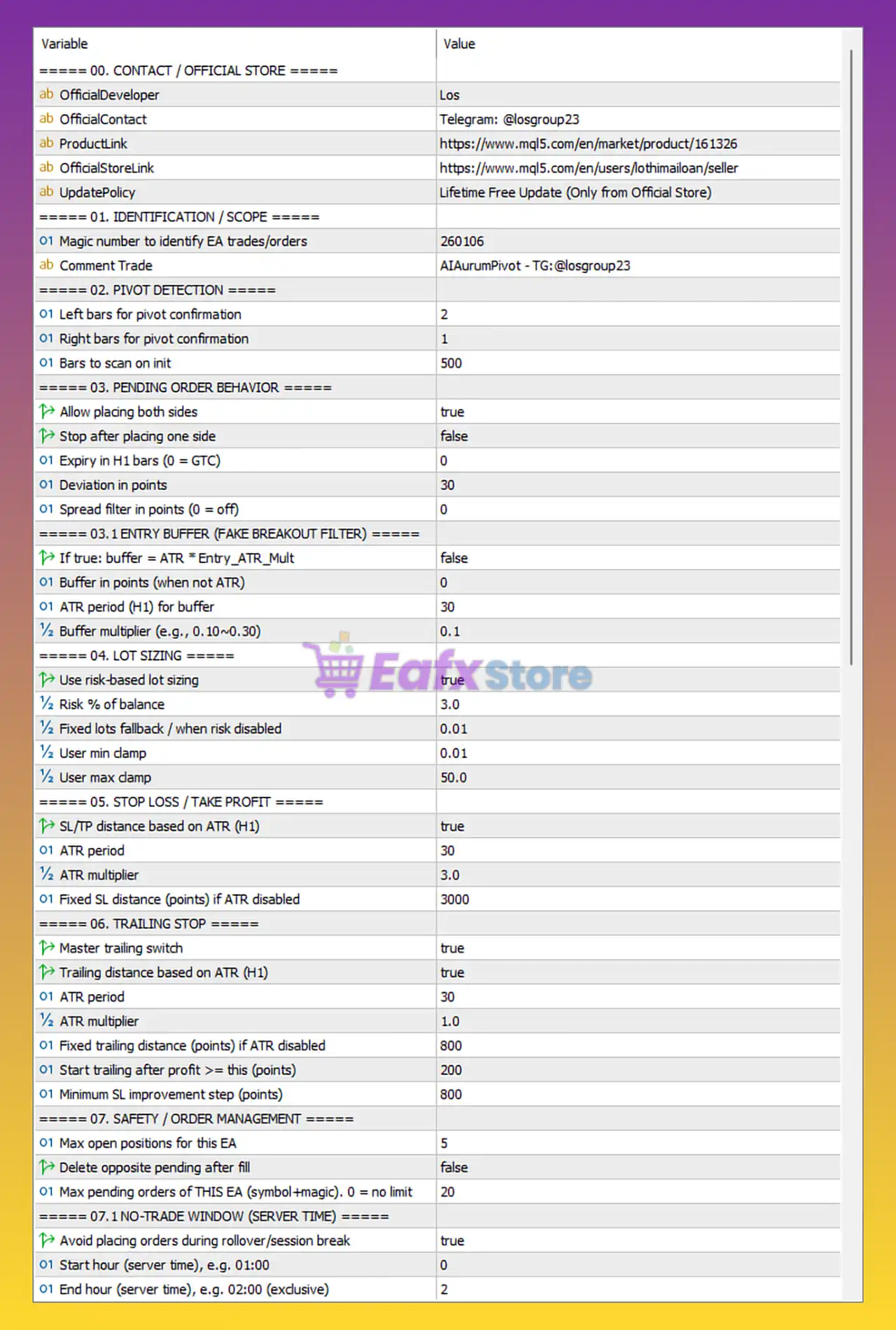 The settings displayed for AI Aurum Pivot EA MT5 define a professional, intelligent, and risk-controlled trading system: