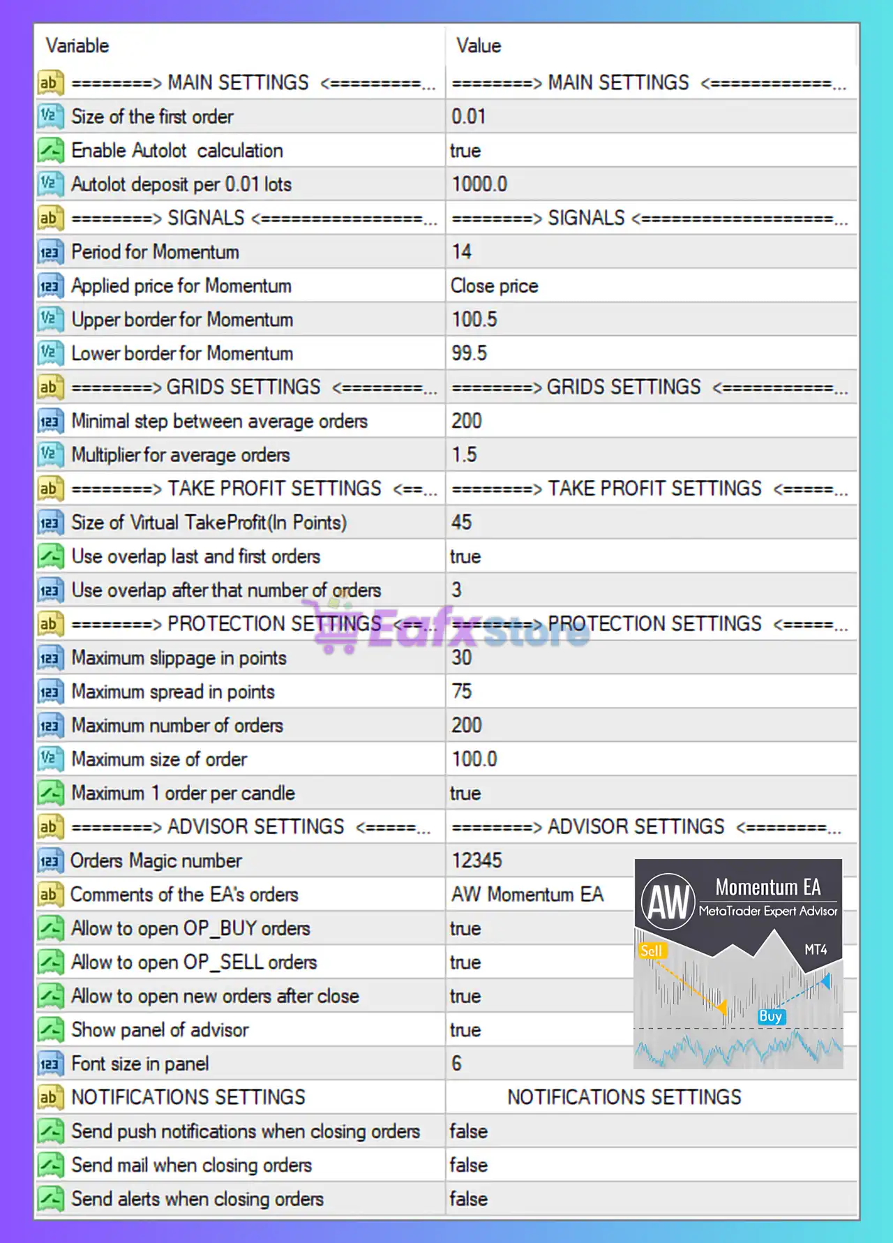 AW Momentum EA is an automated trading system for MetaTrader 4 (MT4) that combines Momentum indicator signals with a Grid and Averaging strategy, enhanced by risk protection and virtual take-profit logic. The settings shown in the image indicate a balanced-to-aggressive configuration, suitable for trending and semi-ranging markets when properly managed.