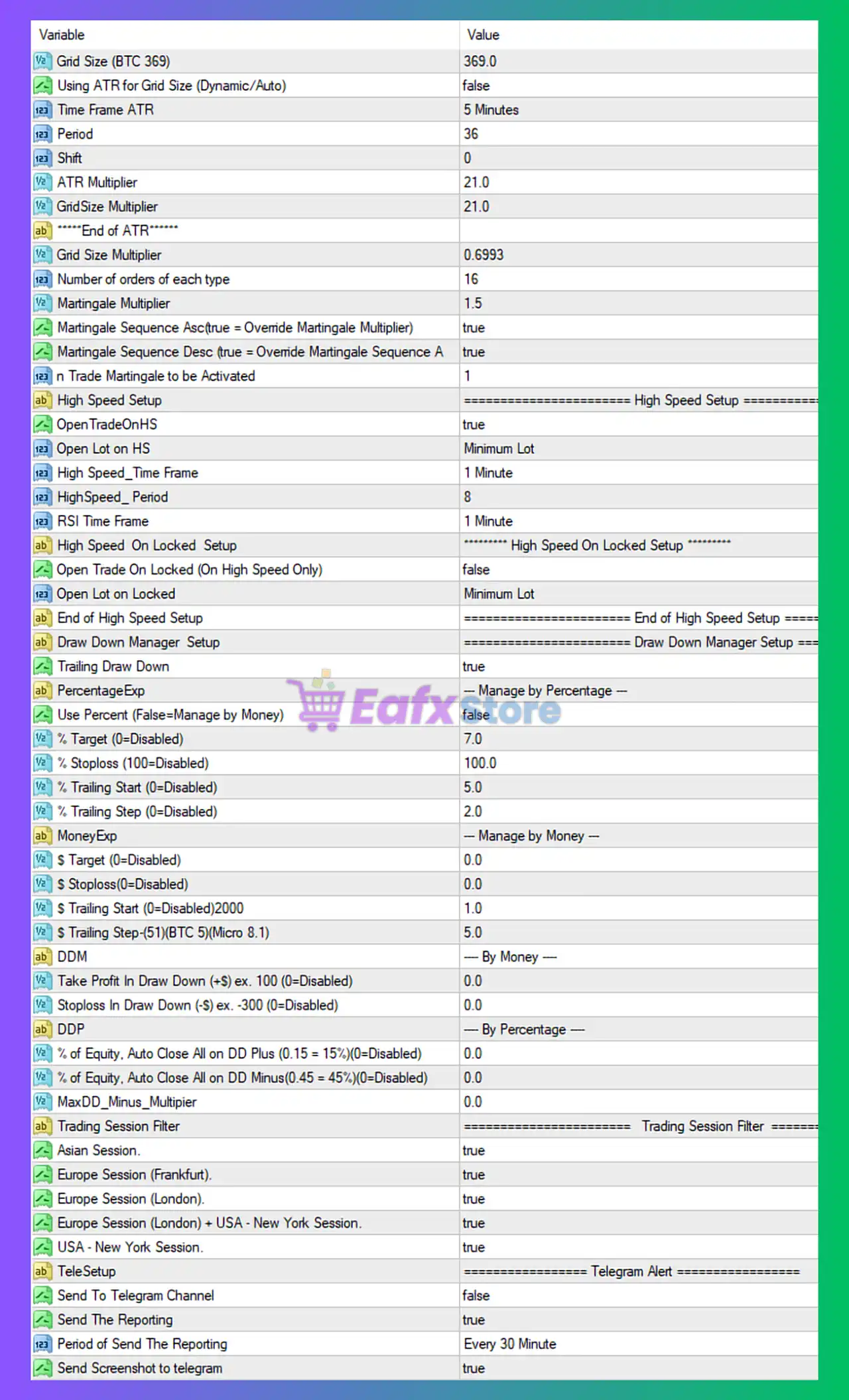 Although ATR parameters are defined, ATR-based grid sizing is disabled, meaning the EA uses a fixed grid distance. This ensures predictable order spacing, but reduces adaptability during volatile market conditions.