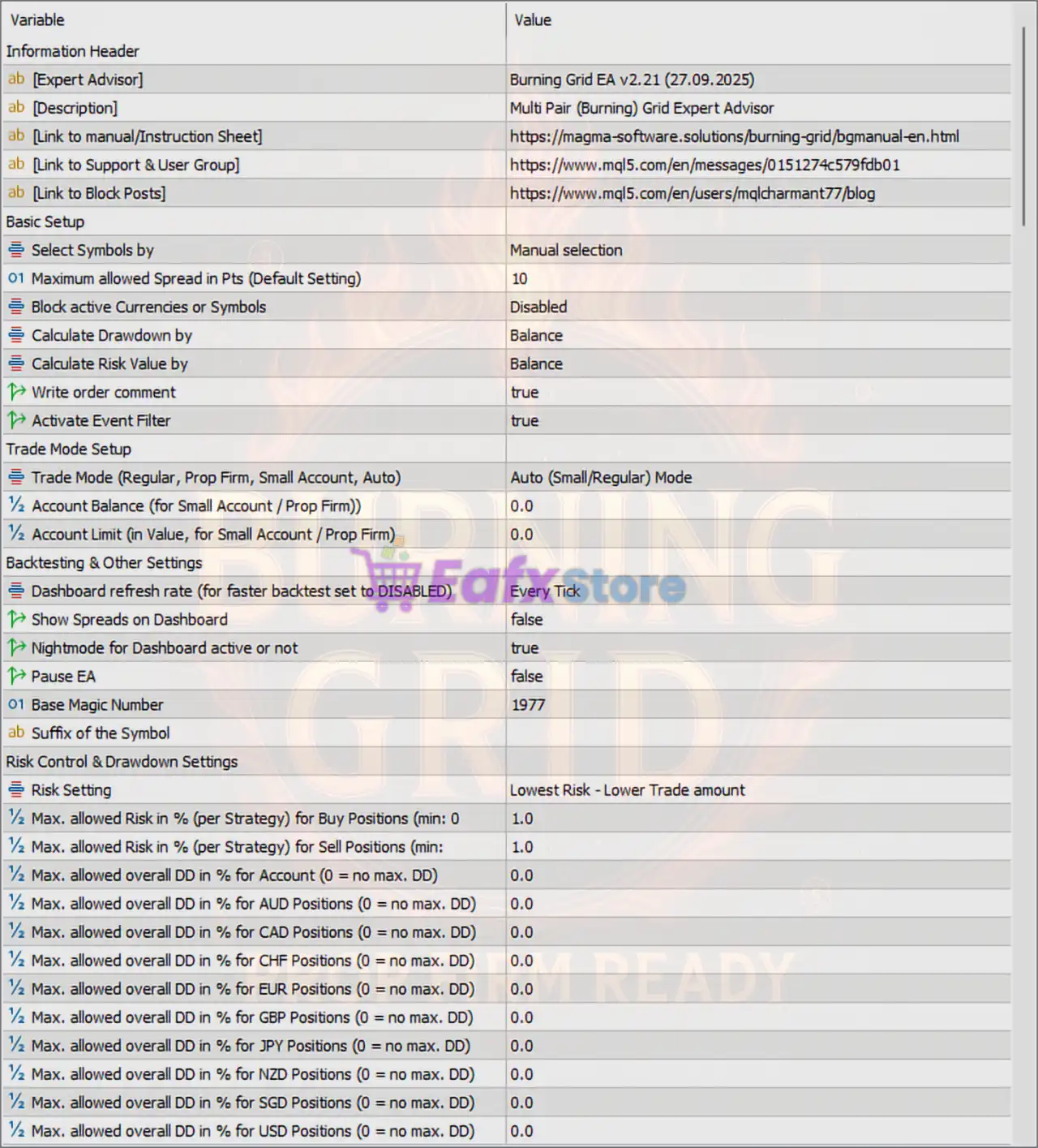 [Expert Advisor] | Burning Grid EA v2.21 (27.09.2025) | Version and release date. Ensures compatibility with current MT5 platform. |