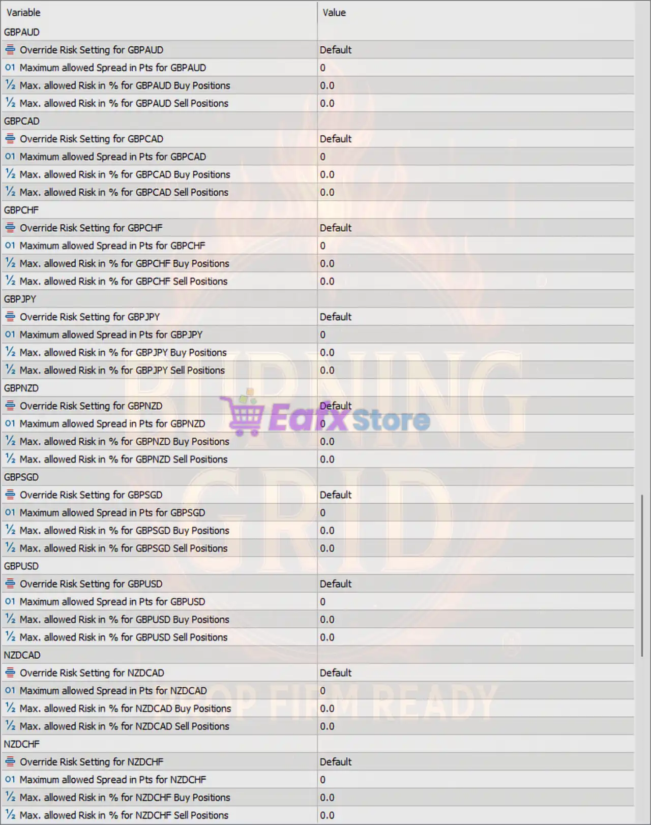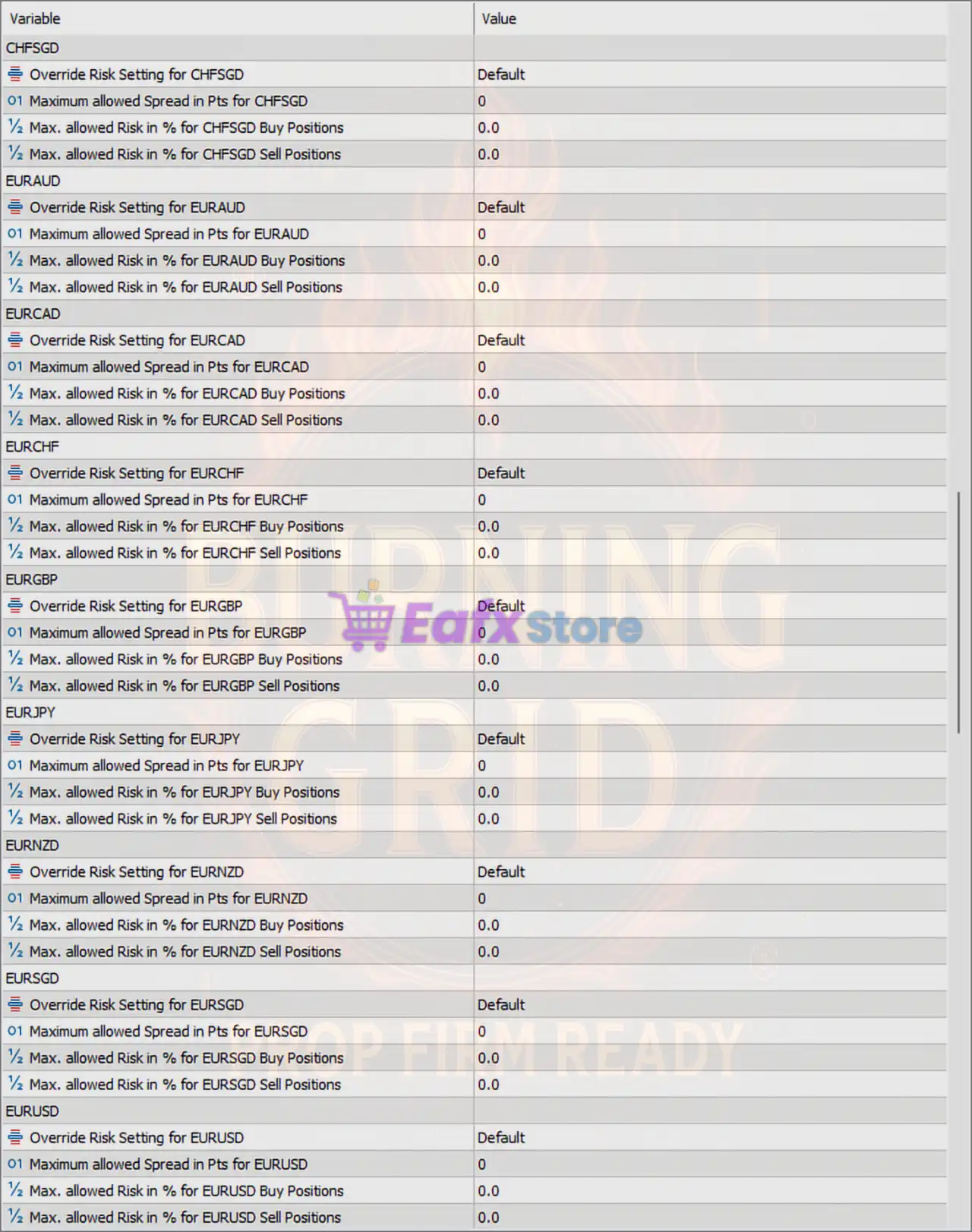 Override Risk Setting (e.g., for EURUSD, GBPJPY, etc.) | Default/Off |