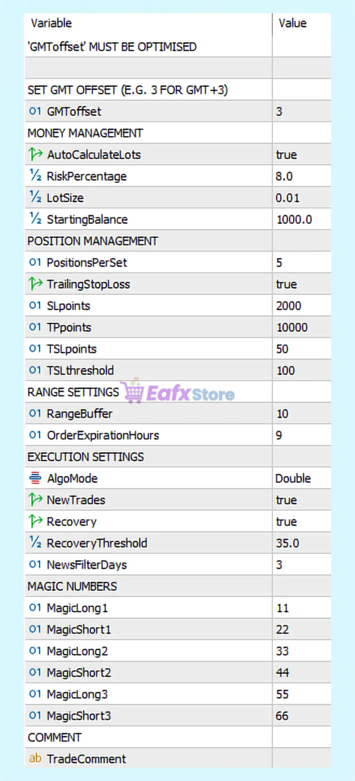 ➡️ Important Note: Correct GMT offset is critical. An incorrect value may cause trades to trigger at the wrong market sessions.