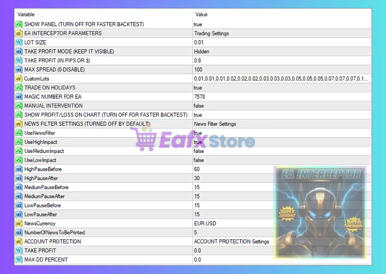 EA Interceptor MT4 is an automated trading robot designed with a fixed-lot, small-target profit model, combined with news filtering and optional account protection. The settings indicate a strategy focused on frequent micro-profits, broker camouflage and fundamental risk avoidance.
