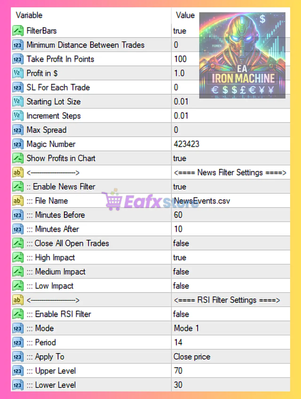 EA Iron Machine is a conservative automated trading robot designed for traders who value news avoidance, small fixed lots, and steady profit targets. With a strong economic news filter, optional RSI confirmation, and incremental lot progression, the EA is well-suited for low-risk trading environments. However, the absence of a hard stop loss means it performs best on reliable brokers with stable execution and disciplined leverage.