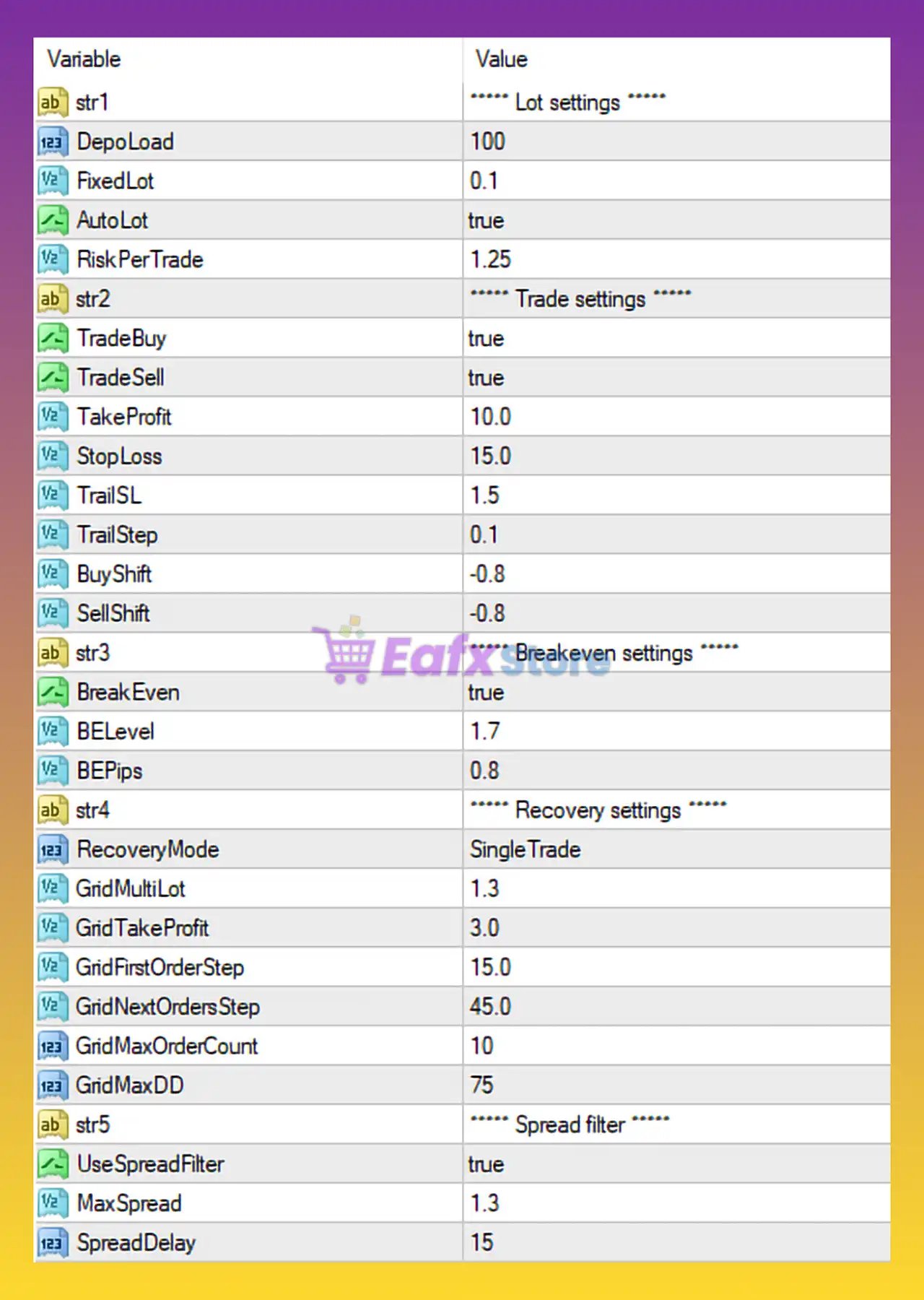 โ Indicates that the EA calculates lot size relative to account balance, promoting proportional risk control. - FixedLot: 0.1