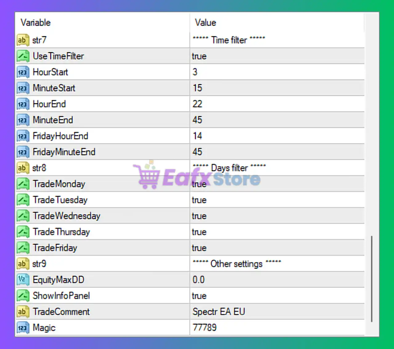 | TradeComment | Spectr EA EU | Trade identification |