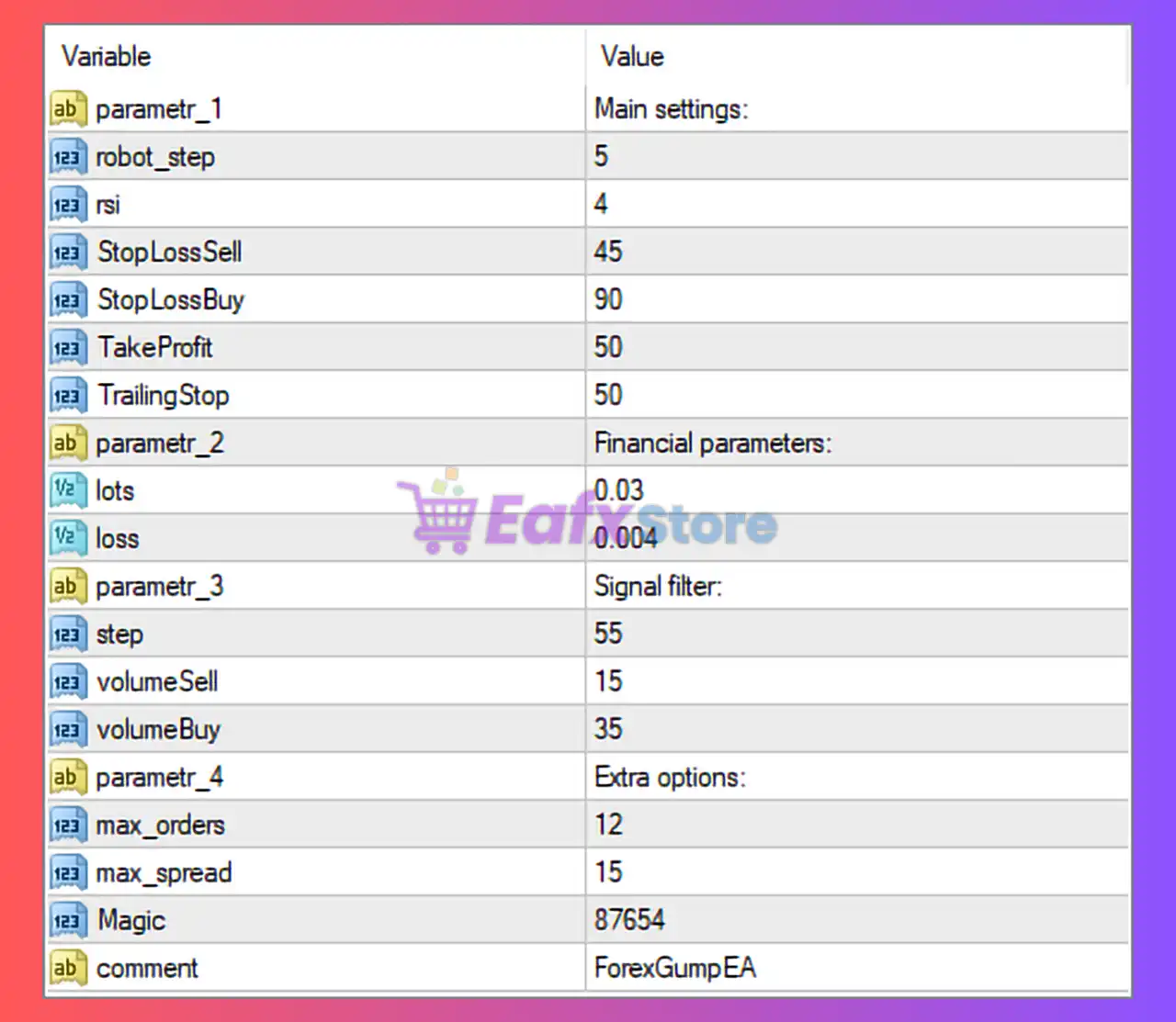 Forex Gump EA is an automated trading robot designed around RSI-based entries, step/grid-style trade management and volume filtering.