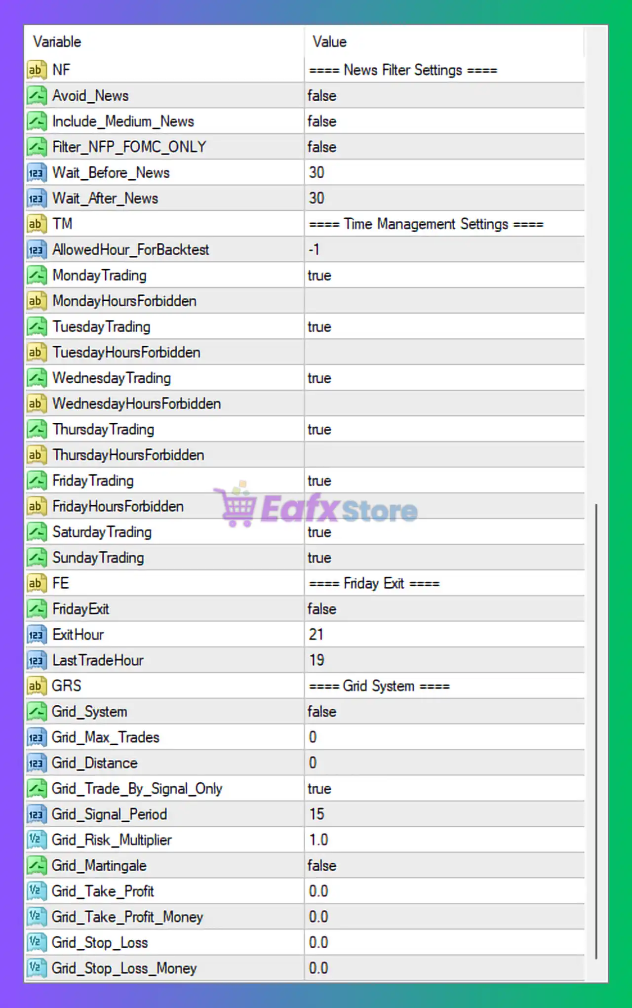 ✅ Monday → Sunday all enabled - AllowedHour_ForBacktest: -1 (no restriction)