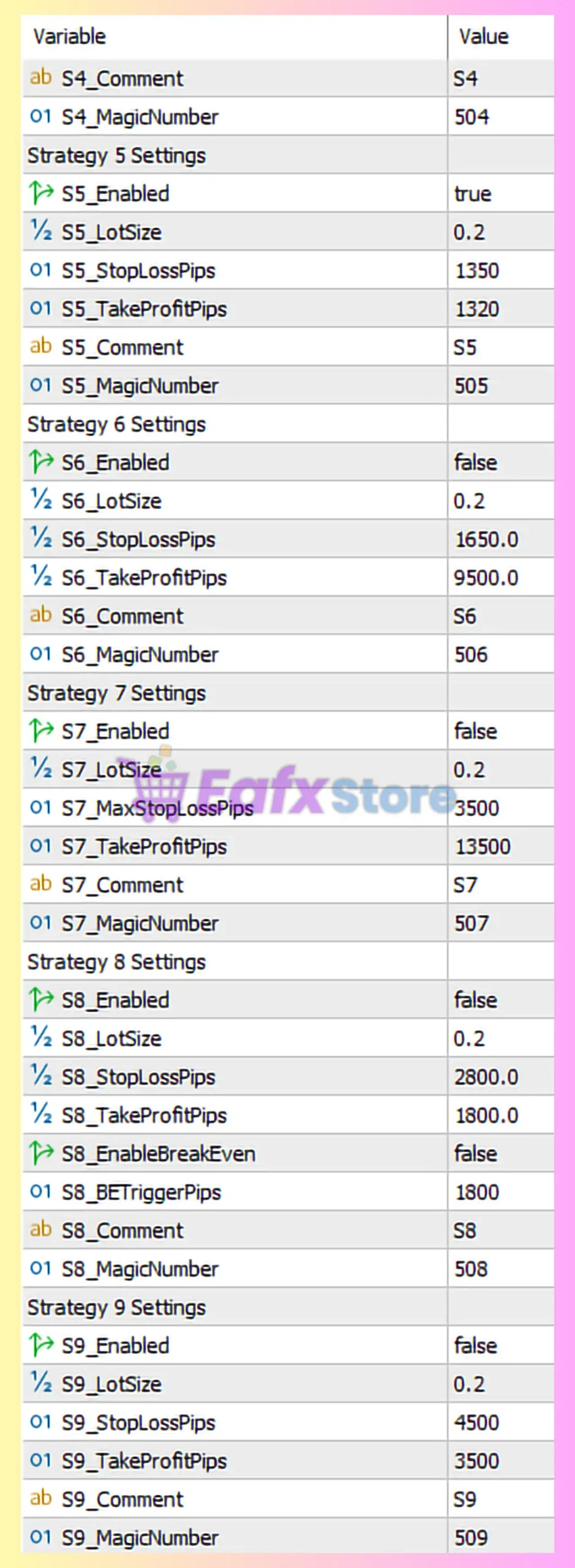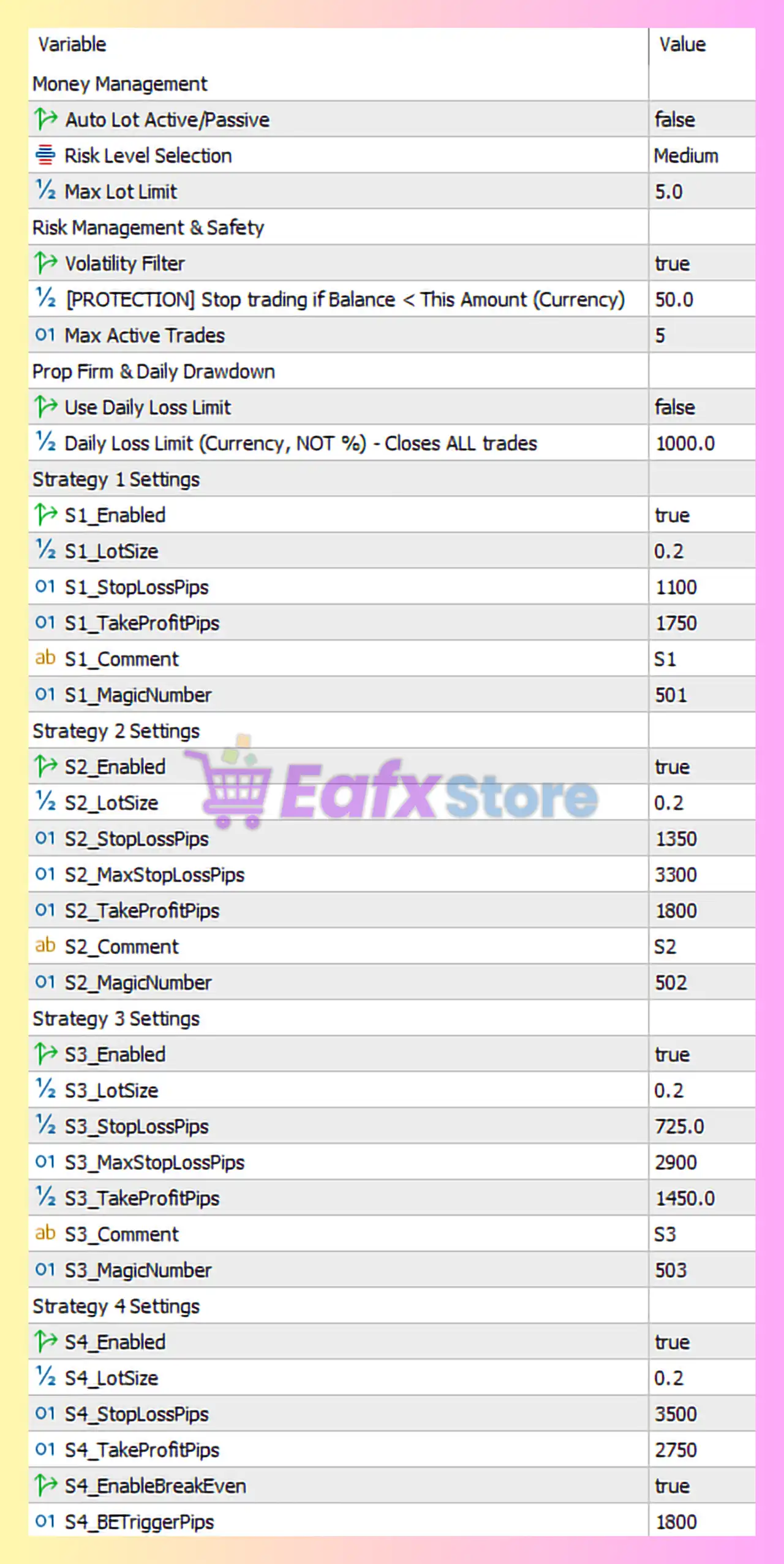 ➡️ Key Insight: Active strategies show diverse stop-loss and take-profit logic, meaning the EA likely combines trend, recovery, and swing trading algorithms.