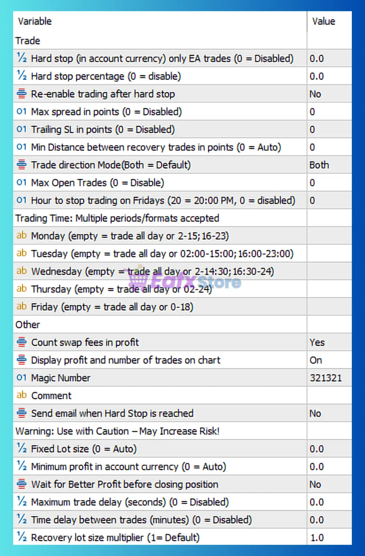 | Min Distance Between Recovery Trades | 0 | Auto distance |