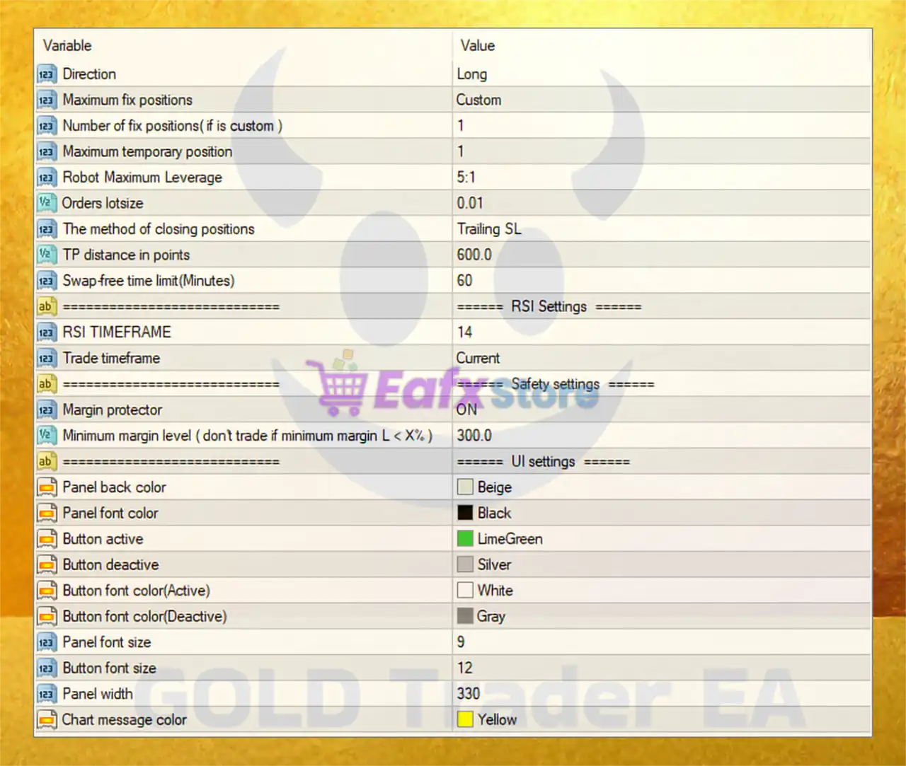 The Greedy Golden MT4 EA includes a customizable trading panel, improving visibility and user experience:
