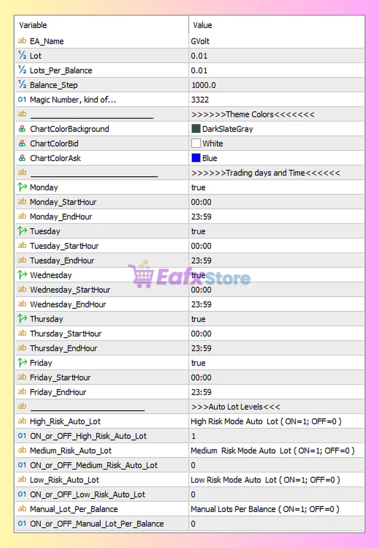 | EA_Name | GVolt | Name of the Expert Advisor |