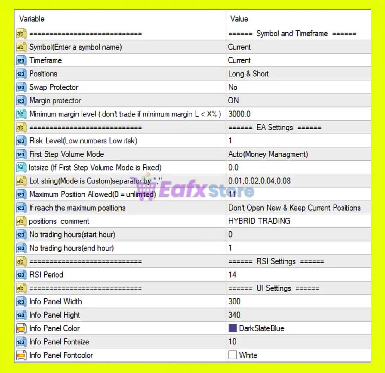 Hybrid Trading RSI Divergence MT4, with the settings shown, is a low-risk, technically driven automated trading system that focuses on RSI divergence signals combined with strict margin and position control.