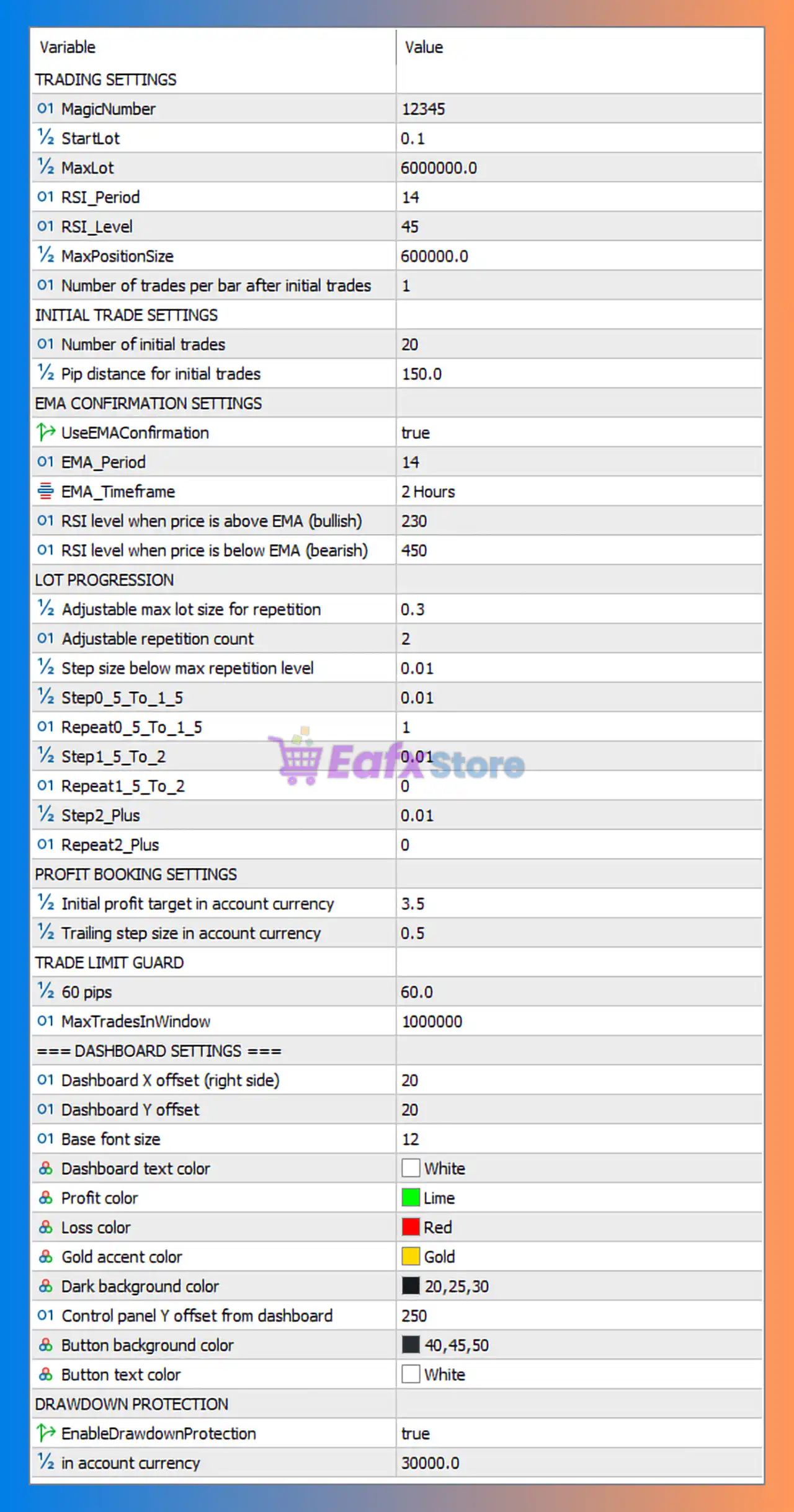 The settings of JKJK FINAL VERSION V3 Pro MT5 reveal a multi-layered algorithm that mixes RSI-based trend filtering, EMA confirmation, controlled lot progression, and strict drawdown protection. This configuration shows a focus on high safety, structured scaling, and precision entries, making the EA suitable for long-term automated trading.