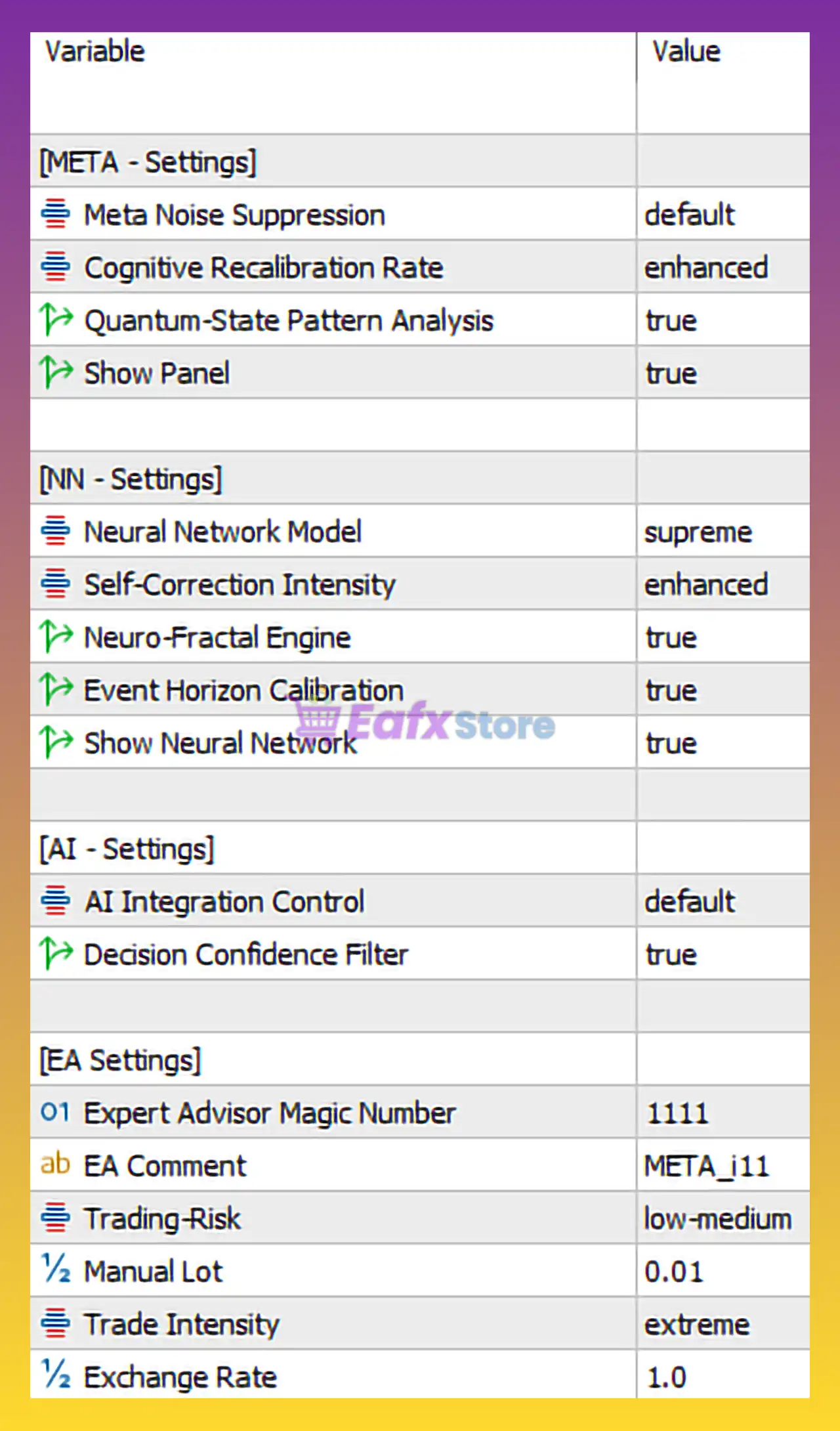 META i11 EA appears to be a high-complexity, AI-focused Expert Advisor optimized for aggressive, high-frequency trading with advanced adaptive logic.
