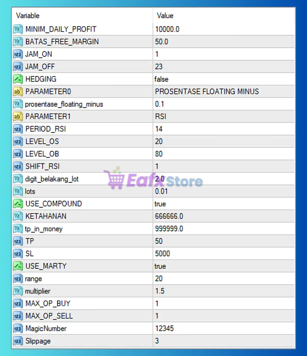 USE_MARTY | true | Martingale enabled (lot increases after loss). |