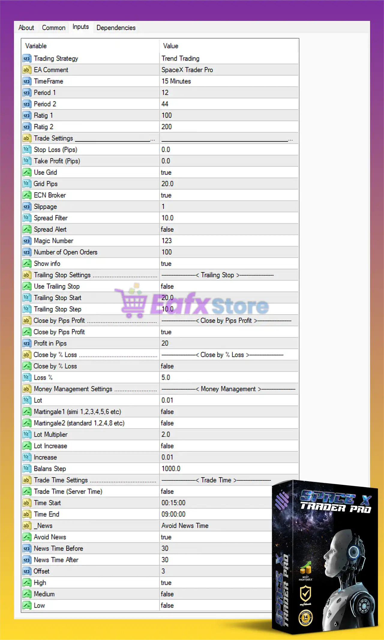 The SpaceX Trader Pro settings reveal a trend-following grid EA designed for medium-risk trading with strong safety mechanisms. By combining grid logic, profit-locking mechanisms, and news filters, this EA is tailored for traders who want both automation and protection.