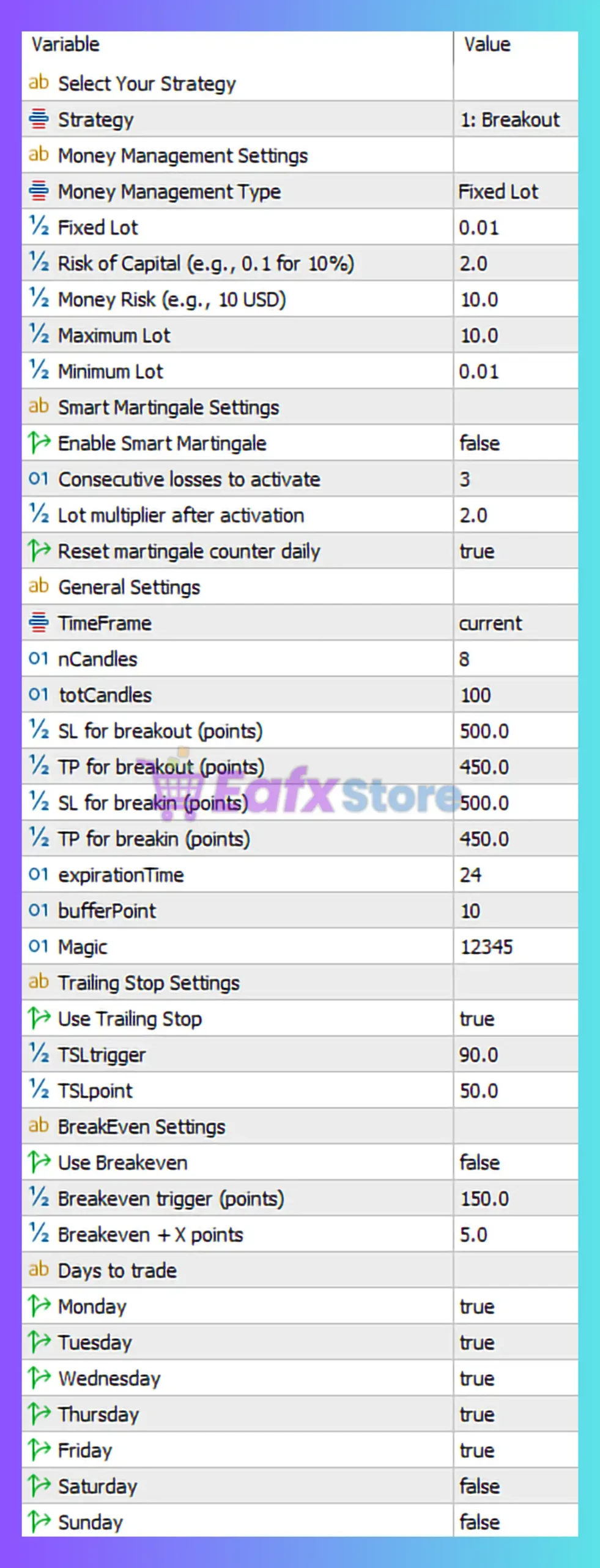 📈 Overall, this configuration reflects a conservative, professional breakout EA optimized for long-term consistency rather than aggressive recovery strategies.