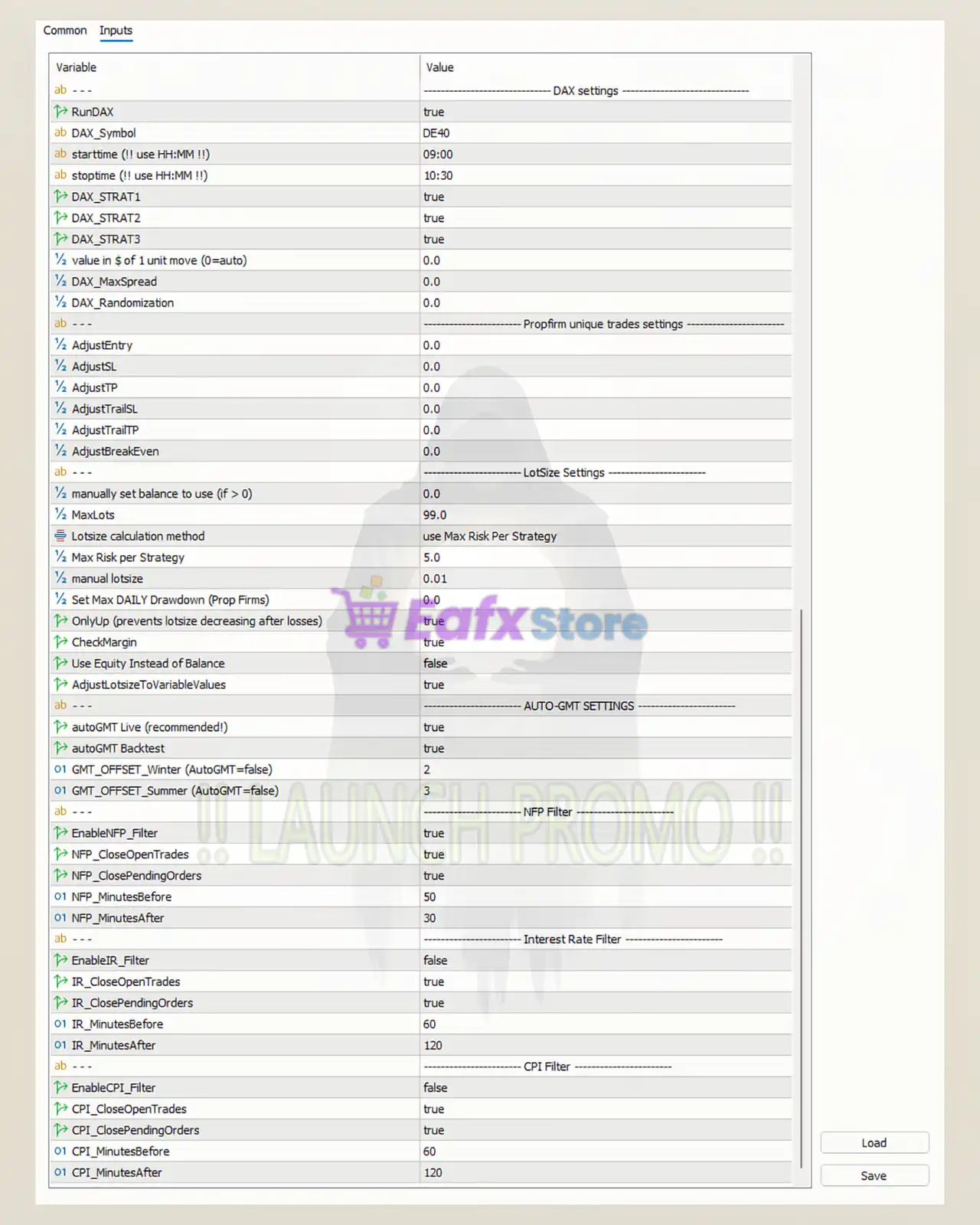 → Focused on the high-volatility period after the Frankfurt open. - DAX_STRAT1, STRAT2, STRAT3: All enabled (