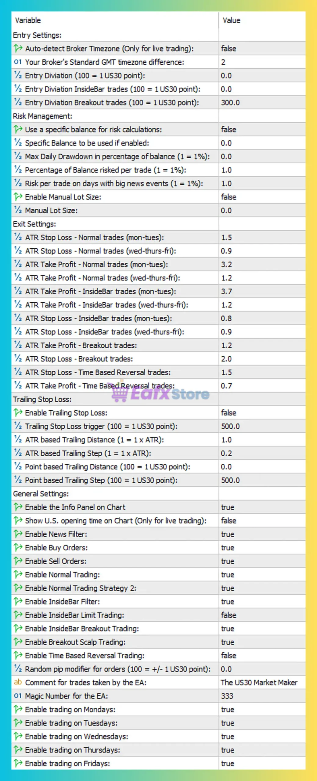 The configuration shown represents a professional-grade, volatility-adaptive market-maker strategy specifically optimized for US30 (Dow Jones) trading.