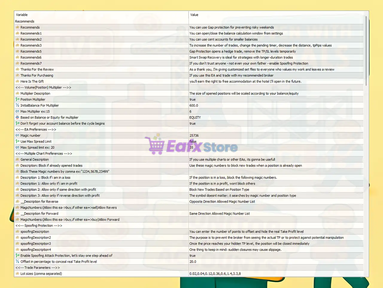 - Spoofing Points Offset: Adds a hidden offset to Take Profit, protecting against broker-side manipulation.