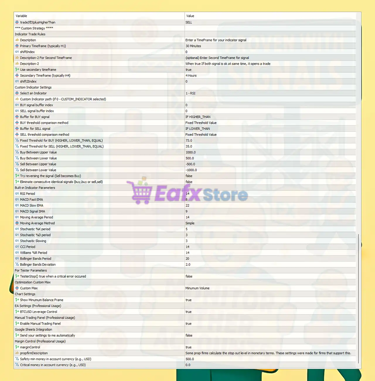 - Custom Indicator Mode: Allows using external or built-in indicators such as RSI, MACD, Stochastic, or Bollinger Bands.