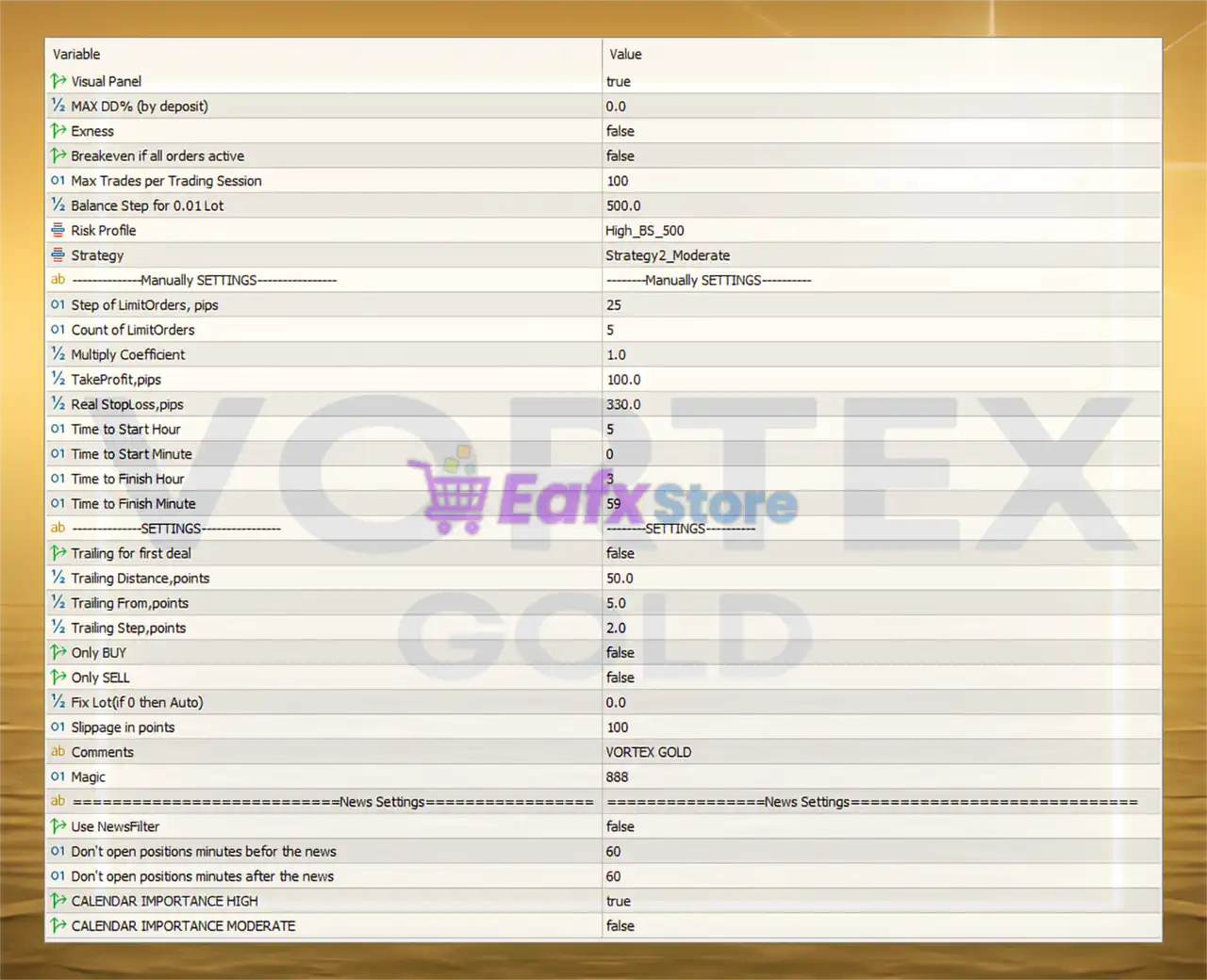 The Vortex Gold EA is a gold (XAUUSD) trading Expert Advisor (EA) designed for the MetaTrader 5 (MT5) platform. The settings in this configuration file reflect a moderate-risk, semi-automated trading approach optimized for stability, control, and precise risk management.