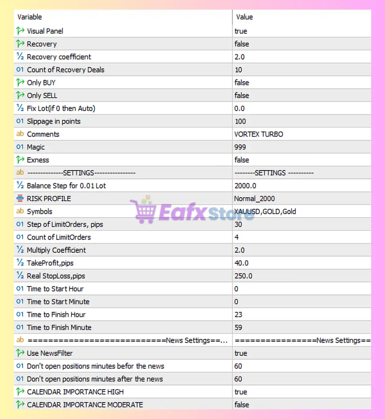 The shown settings represent a balanced and relatively safe configuration for Vortex Turbo EA MT5, especially for Gold trading on medium to large accounts ($2,000+). As long as Recovery remains disabled, this setup is suitable for traders seeking steady performance with controlled risk.