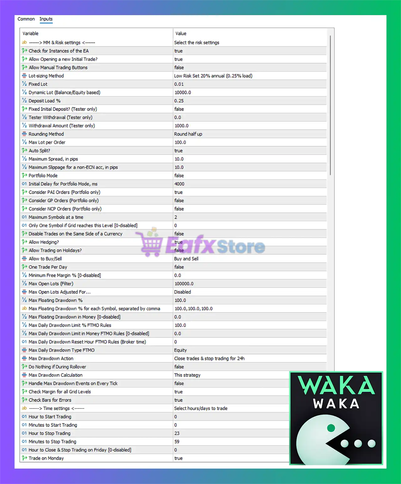 👉 Note: These settings make Waka Waka EA MT5 one of the most reliable robots for traders who prioritize low-risk automated trading and prop firm compliance.