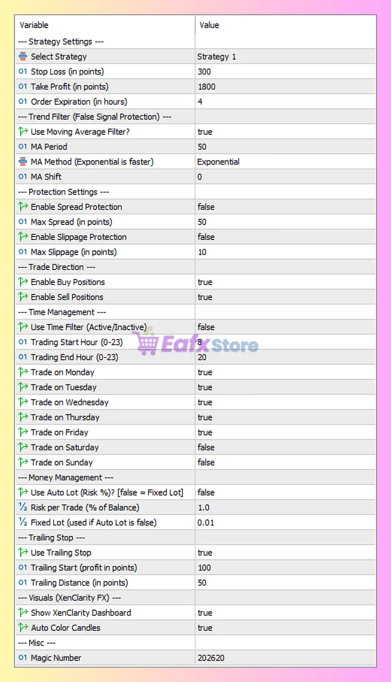 These parameters define the core trading logic of XenClarity EA.