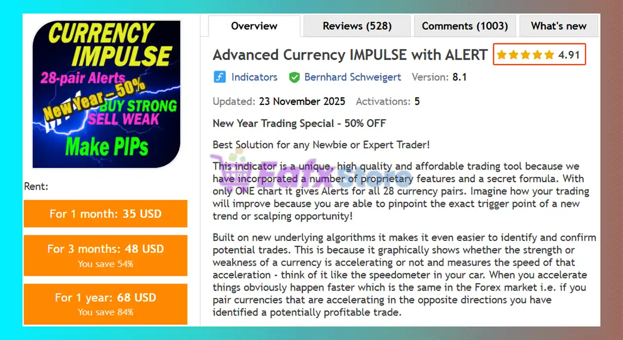 This product is compiled by Bernhard Schweigert. This Morocco author has more than +10 years of experience working on MQL5 with many famous products such as Advanced Currency IMPULSE with ALERT MT4, TickUnit Scalper Currency Strength28 PRO, Advanced Dashboard for Currency Strength and Speed MT4 and others. Among them, Advanced Currency IMPULSE with ALERT is his best performing product.