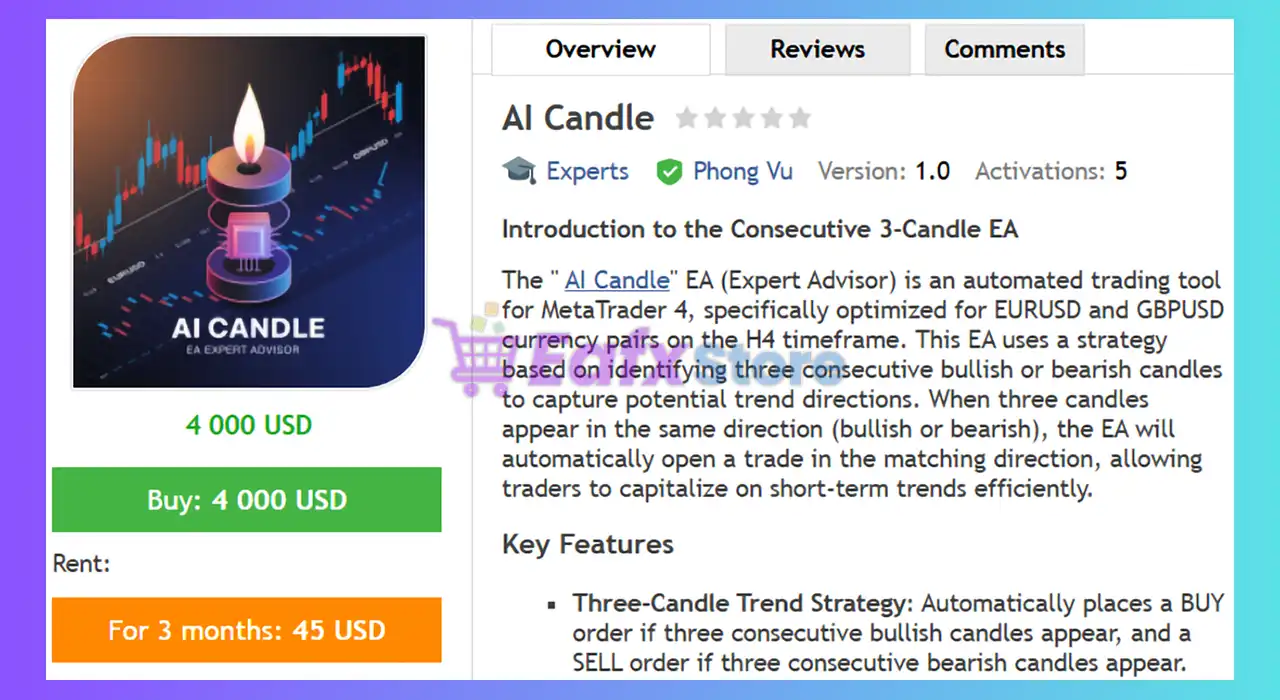 This product is compiled by Phong Vu. This author has more than +10 years of experience working on MQL5 with many famous products such as AI Candle EA MT4, AI Candle EA MT5, Smart Trade EA MT4, Nice Forex Pro MT4 and other advisors. Among them, AI Candle EA is his best performing product.