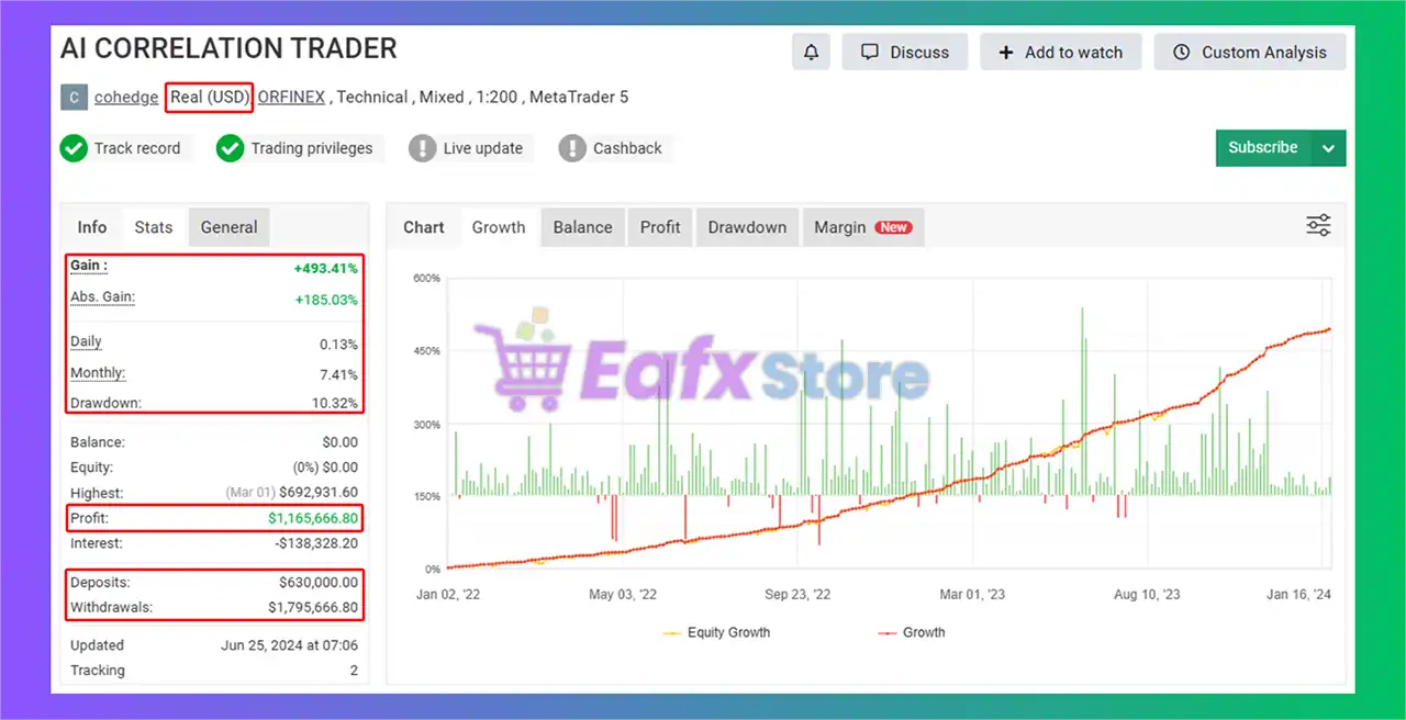 In short, AI Correlation 2024 EA combines AI-driven filtering with cross-pair correlation hedging to deliver low-risk, diversified trading performance. Its conservative lot sizing, controlled grid entries, and smart news avoidance ensure stable growth and minimal drawdown. With verified +493% gains and under 11% drawdown, it proves that disciplined correlation trading can achieve intelligent, long-term profitability.