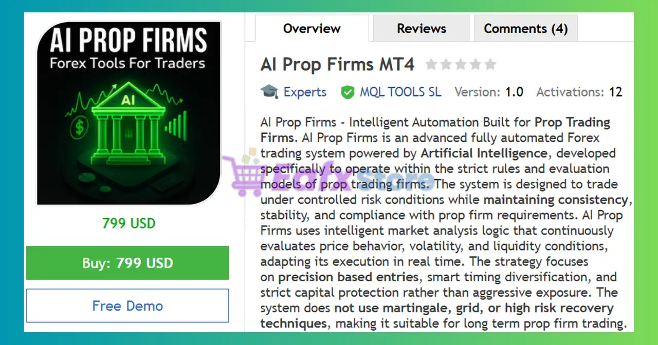 The AI Prop Firms MT4 is a specialized trading robot designed to help traders pass prop firm evaluations and manage funded accounts. It uses artificial intelligence to scan for high-probability setups while strictly adhering to the complex risk rules set by proprietary trading firms.