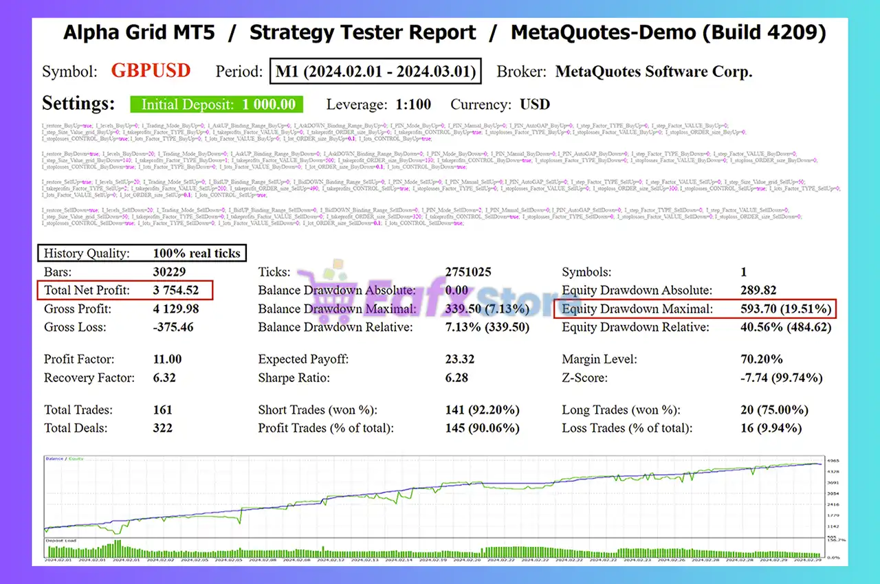 🔶 The Alpha Grid MT5 backtest trading results achieved impressive profit performance for 1 months on the GBPUSD pair.