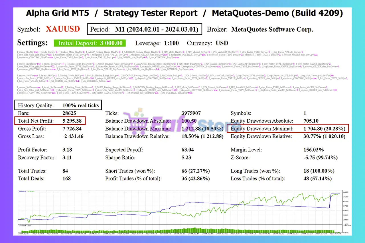 🔶 The Alpha Grid MT5 backtest trading results achieved impressive profit performance for 1 months on the XAUUSD pair.
