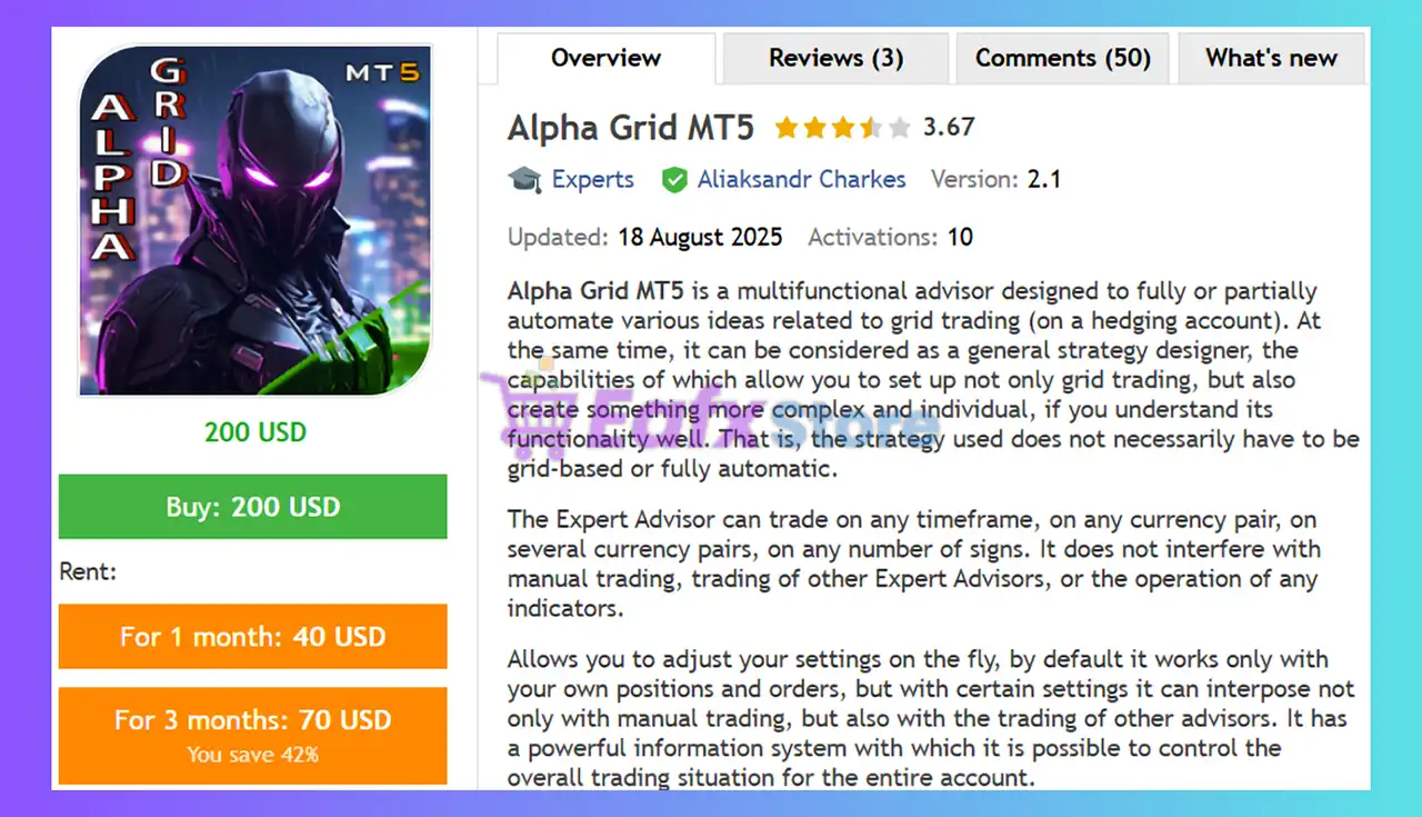 This product is compiled by Aliaksandr Charkes. This author has more than +9 years of experience working on MQL5 with many famous products such as Alpha Grid MT5, Magic Grid MT5, Master Grid MT5, Elastic Grid MT5 and other advisors. Among them, Alpha Grid MT5 is his best performing product.