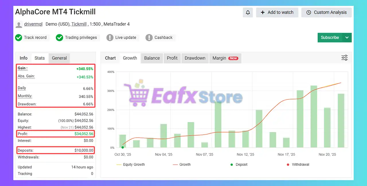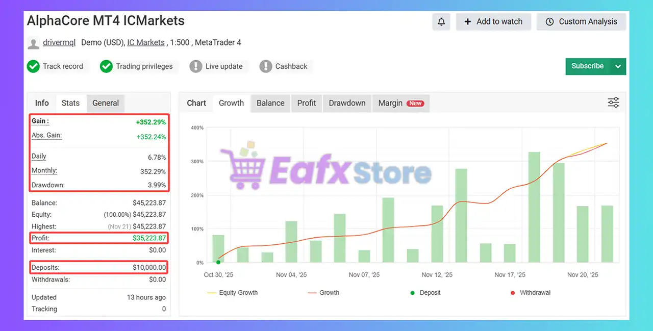 AlphaCore System has been verified profitable by MyFxBook in the long term and has achieved impressive returns. The advisor shows good Gold trading potential and high profit rate.