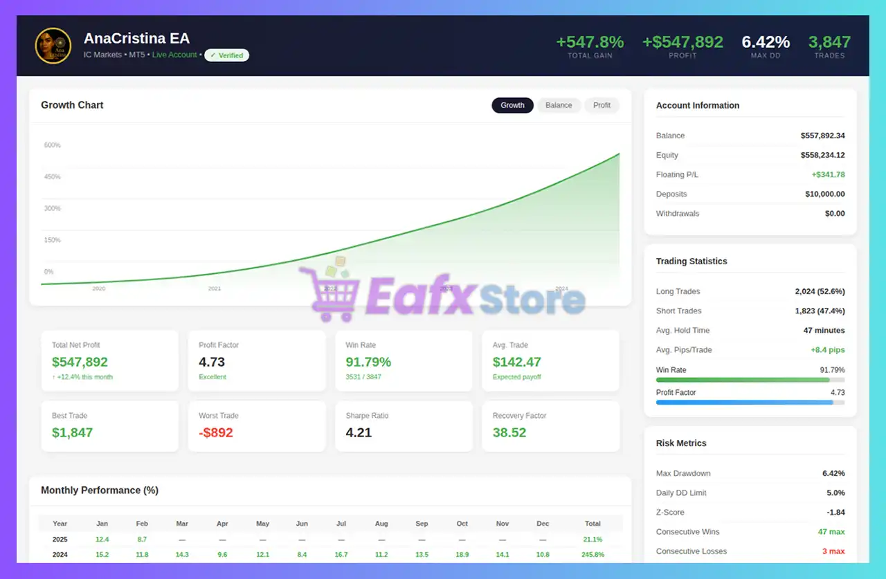 Many traders choose AnaCristina MT5 because it combines multi-currency trading, adaptive market analysis, and structured risk management to create a stable automated Forex trading system.
