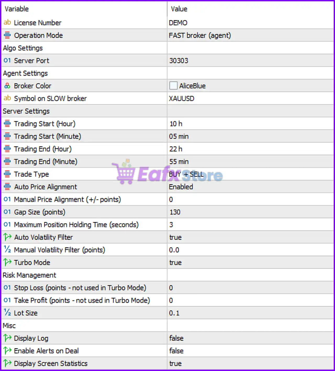 - Custom risk management: Allows users to set maximum order holding time, Stop Loss (SL), Take Profit (TP) and Trade Volume.