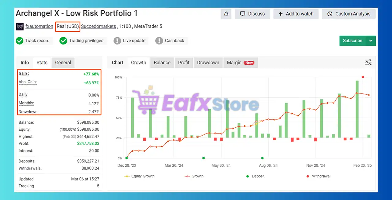 Low Drawdown: On EURUSD & EURCAD, it gained +77.68% with an incredibly low maximum drawdown of only 2.47%.