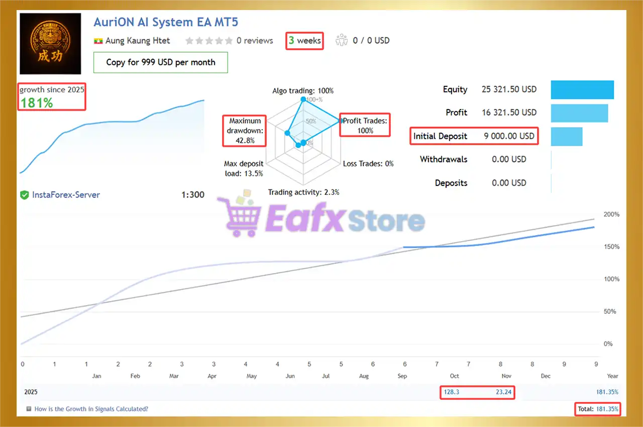In real-account trading, it reached +181% growth in 3 weeks with 100% win rate, showing both consistency and strong risk control.