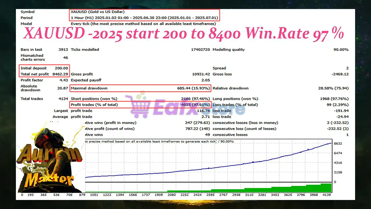 Based on a $200 initial deposit, Aurum Master EA achieved $167,235 net profit, a 97.62% win rate, and a maximum drawdown of 19.19% in a 6-month backtest on XAUUSD (Gold).