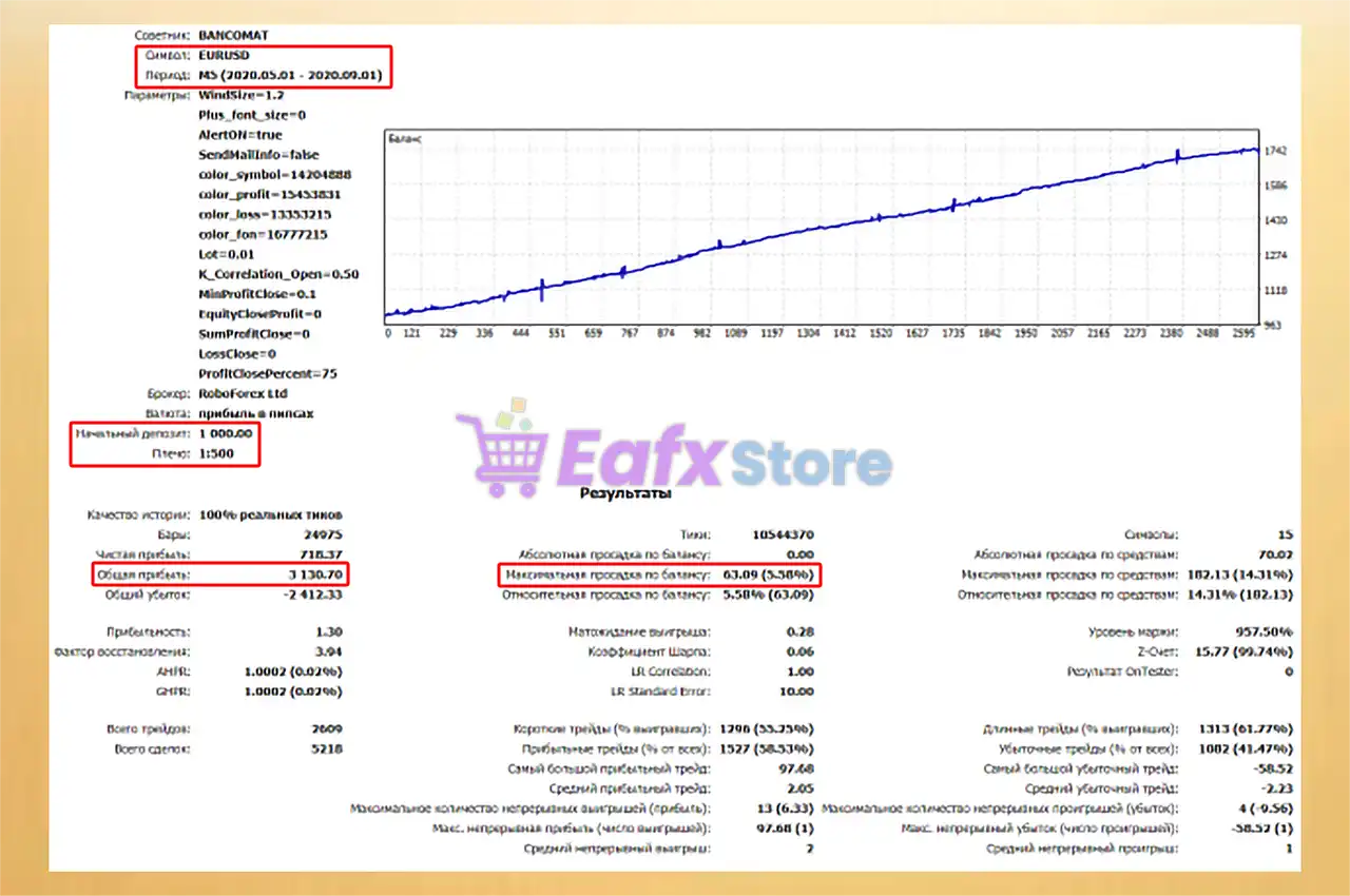 🔶 The Bancomat EA backtest trading results achieved impressive profit performance for 4 months on the EURUSD pair.