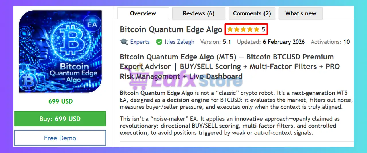 ➡️ RatmanPoway (2026.02.03): “I demoed and backtested Bitcoin Quantum Edge and I liked the results. Very few trades for the backtest but good profit and very littlle drawdown. Highly recommend.”