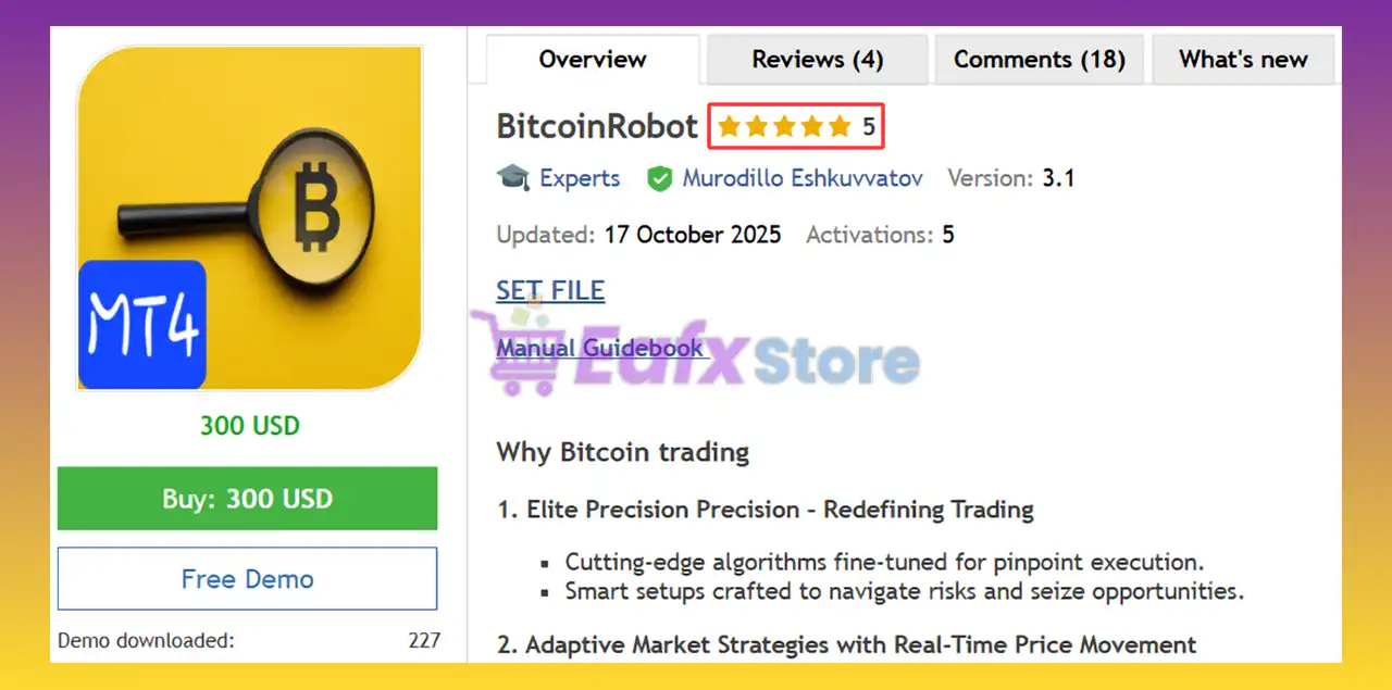 In short, BitcoinRobot MT4 is a game-changing automated trading solution designed to maximize profitability and minimize risk in Bitcoin trading. With its advanced algorithms, real-time market monitoring, and adaptive strategies, this expert advisor ensures precision and efficiency, making it an ideal choice for both beginners and professional traders.