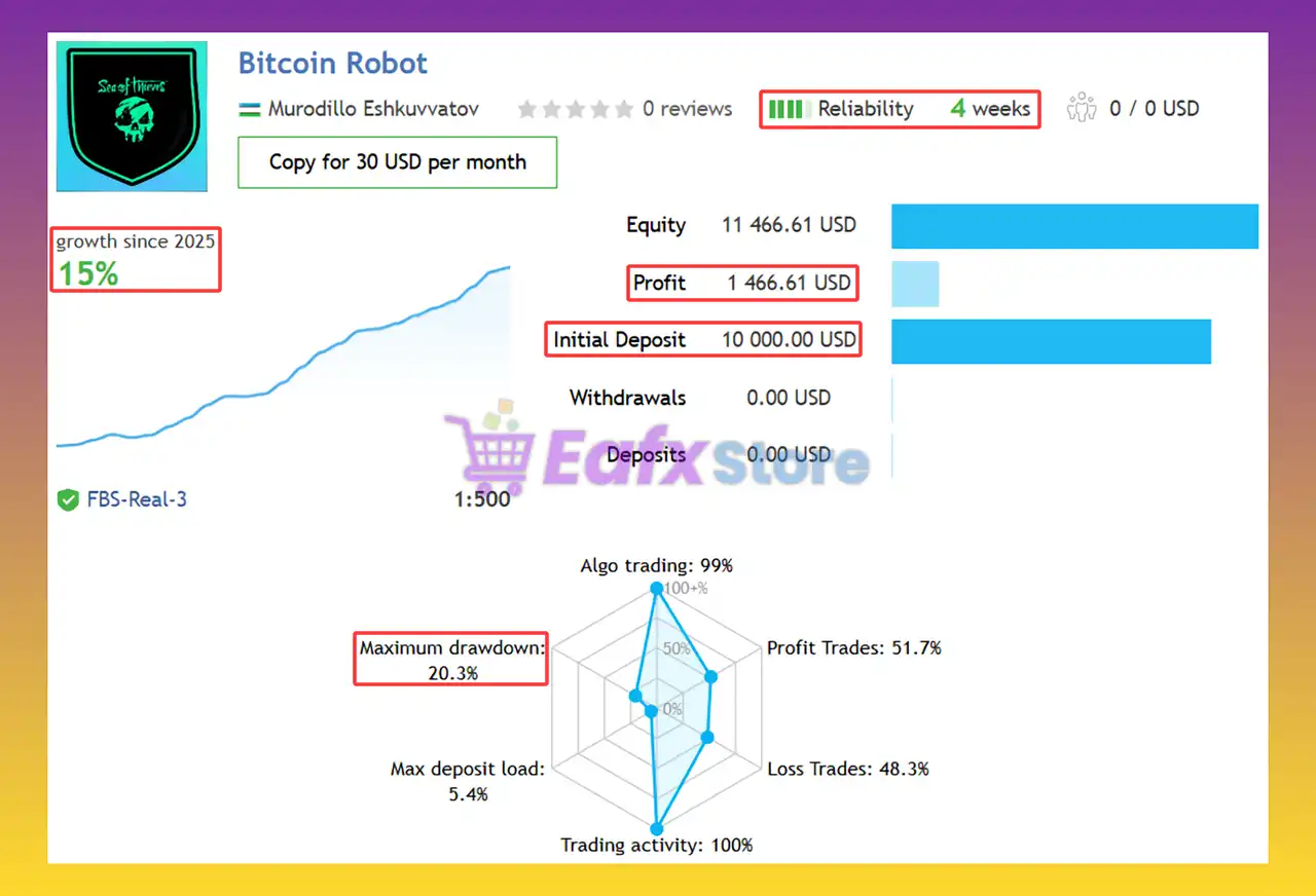BitcoinRobot shows significant potential in providing stable and reliable profits, becoming a reliable tool in the forex market. This advisor is highly appreciated by the community in many aspects and has won the trust of users.
