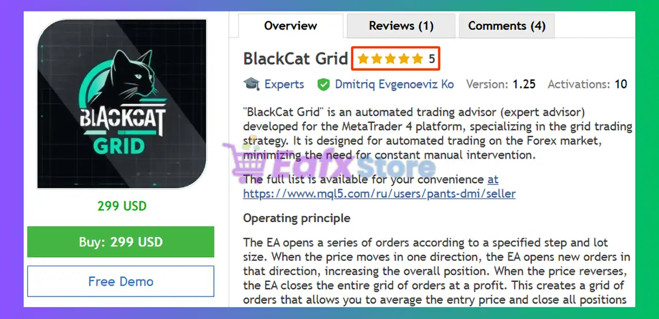 This product is compiled by Dmitriq Evgenoeviz Ko. This author has more than +5 years of experience working on MQL5 with many famous products such as BlackCat Grid EA MT4, You Golden Joker MT4, Black Gold MT4, Gold Angel MT4, Golden Harmony MT4 and other advisors. Among them, BlackCat Grid EA is his best performing product.